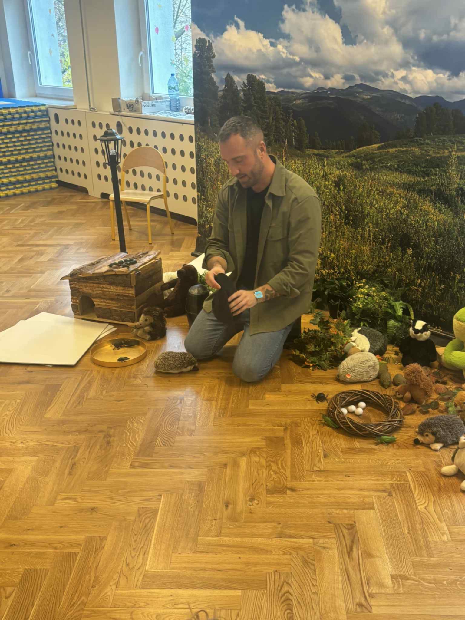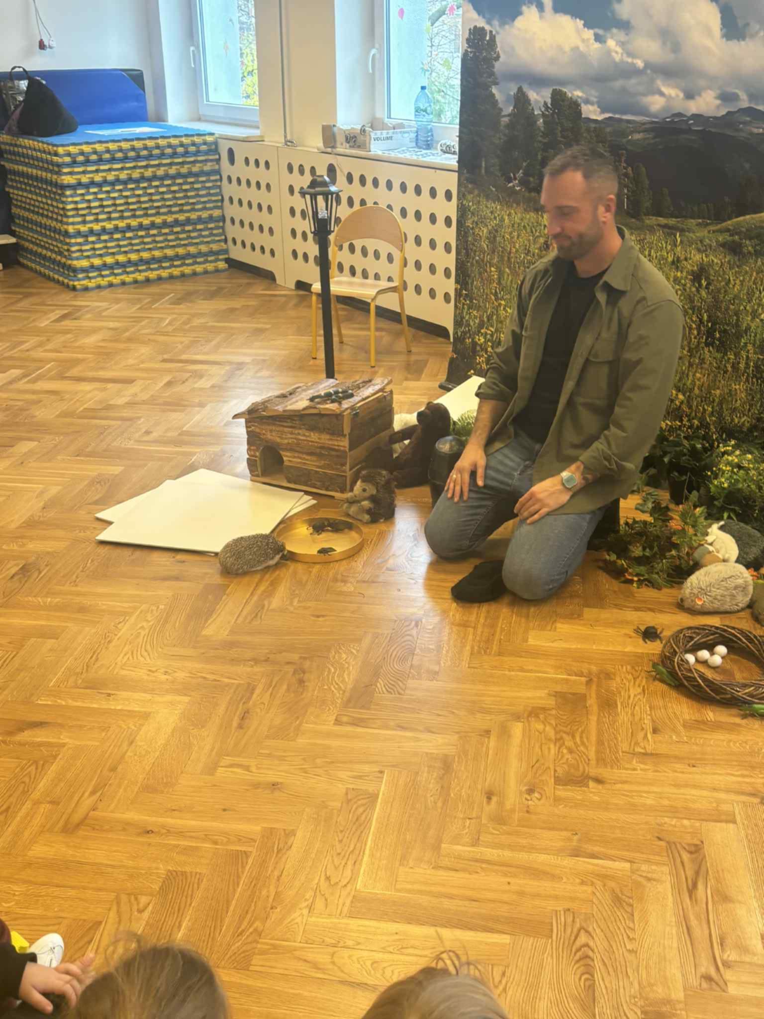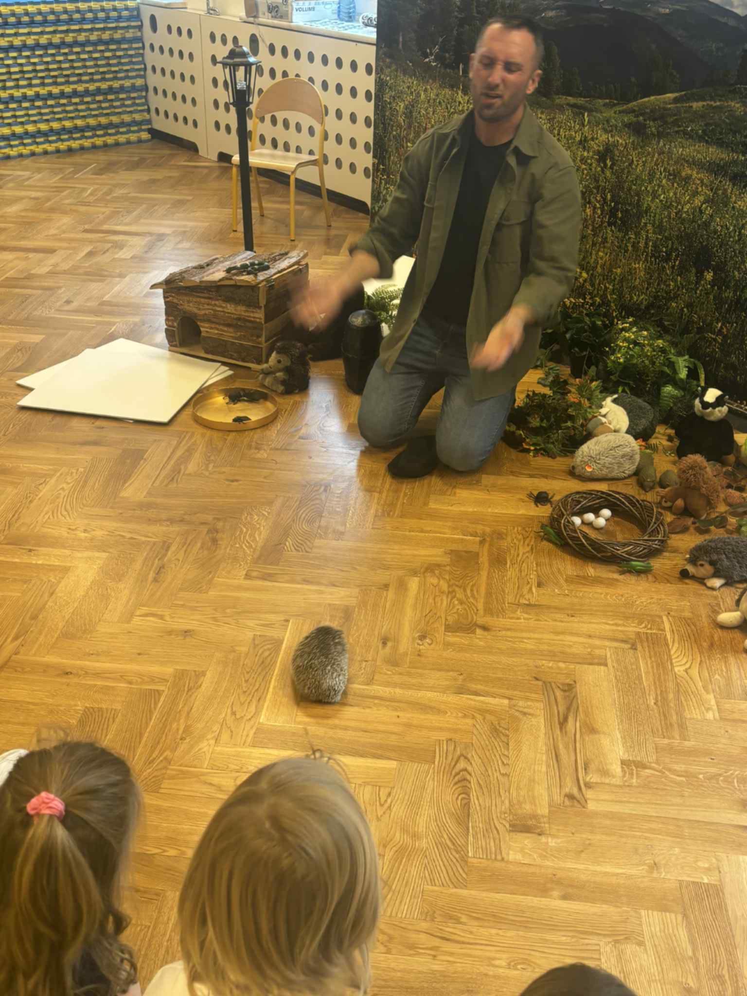 Dzieci zobaczyły też, co jeże lubią chętnie podjadać i z zachwytem obserwowały, jak nasza kolczasta przyjaciółka spaceruje między nimi. Było dużo śmiechu, zdziwienia i opowieści o życiu w lesie.