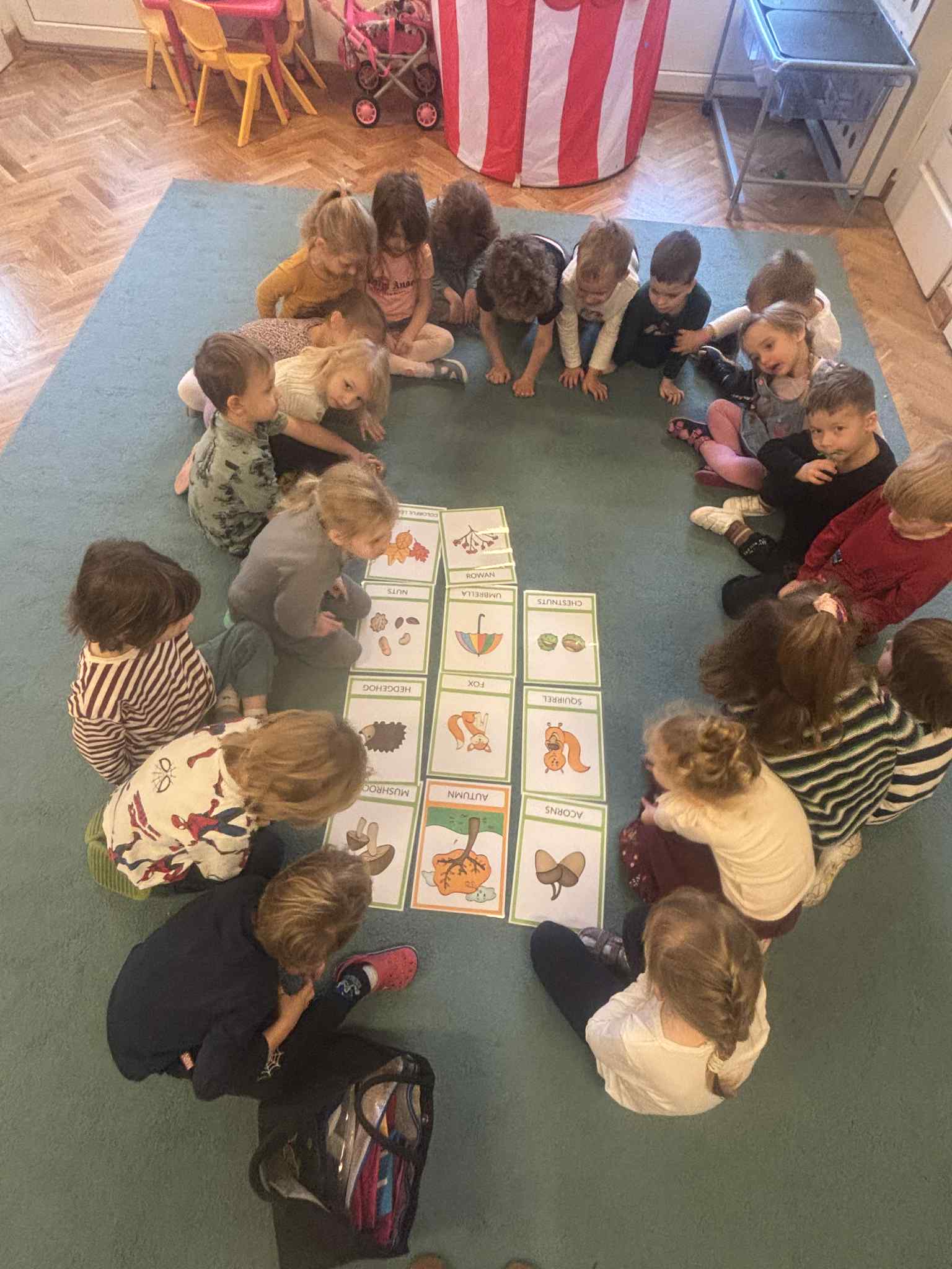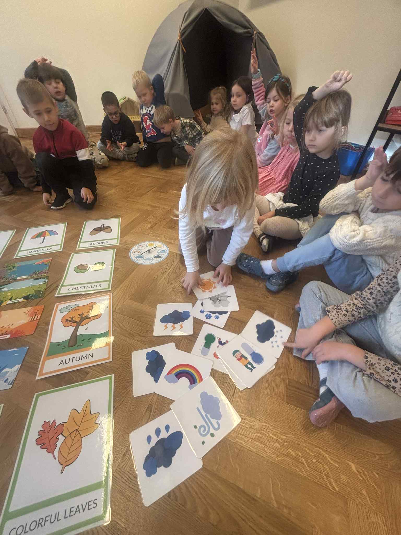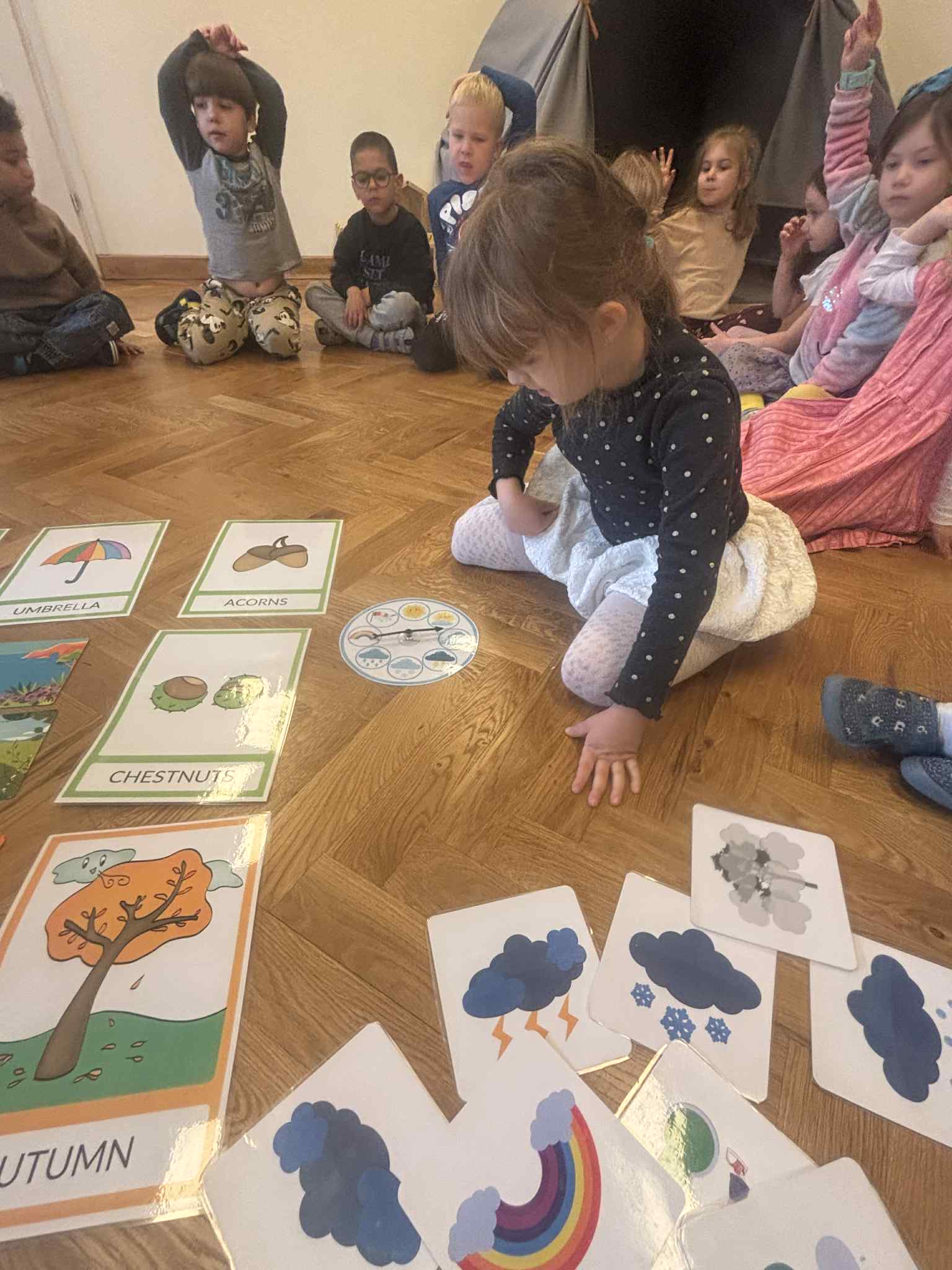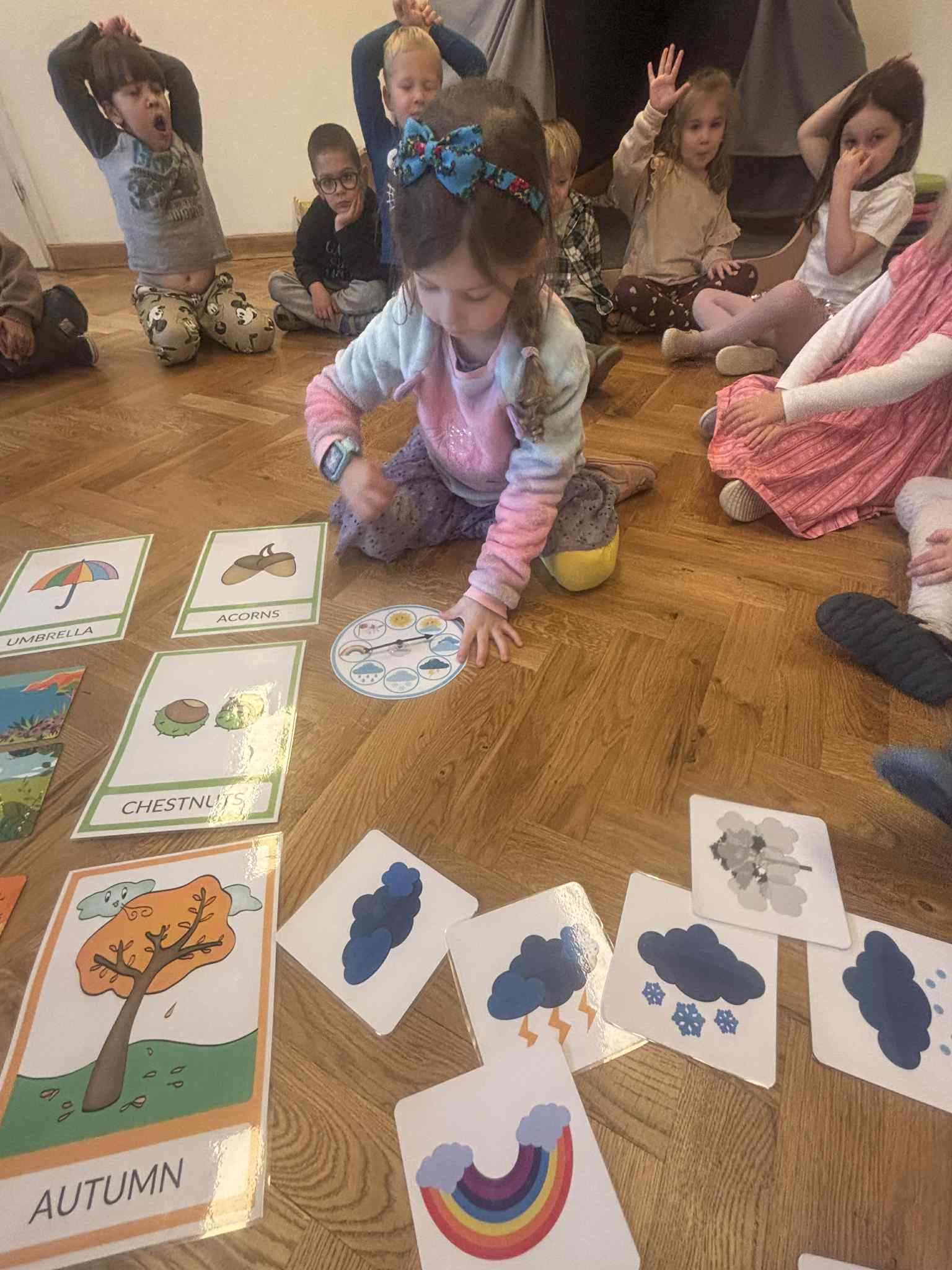 Przedszkolaki utrwalały słownictwo związane z jesienią, pogodą, zwierzętami i przyrodą.