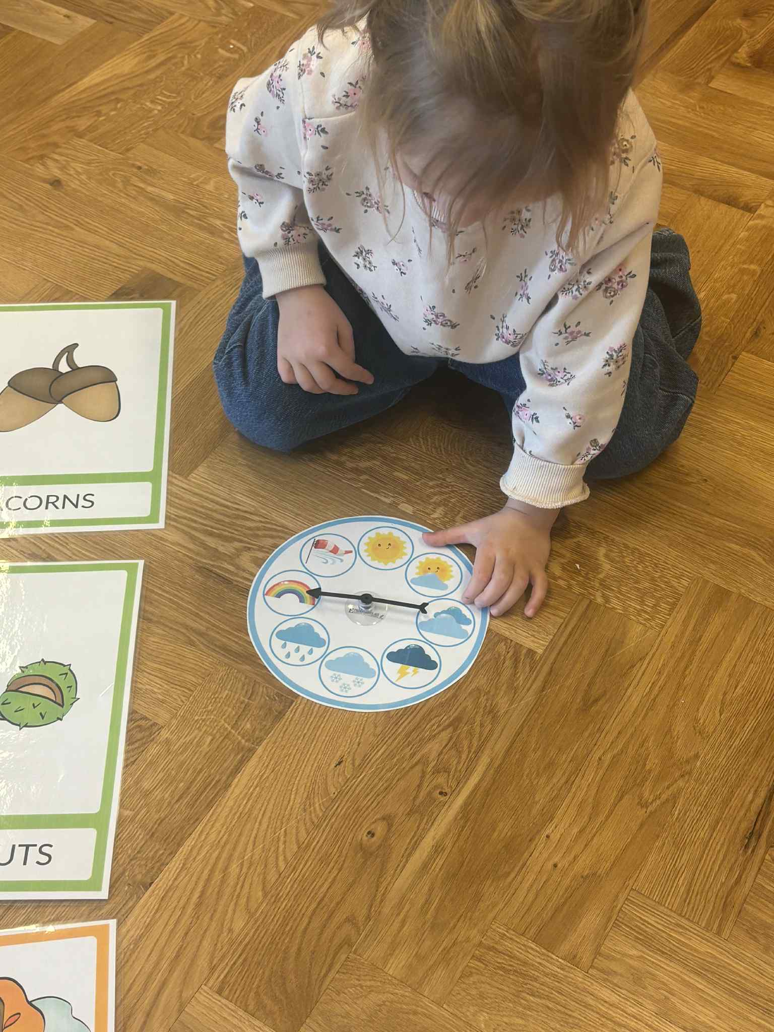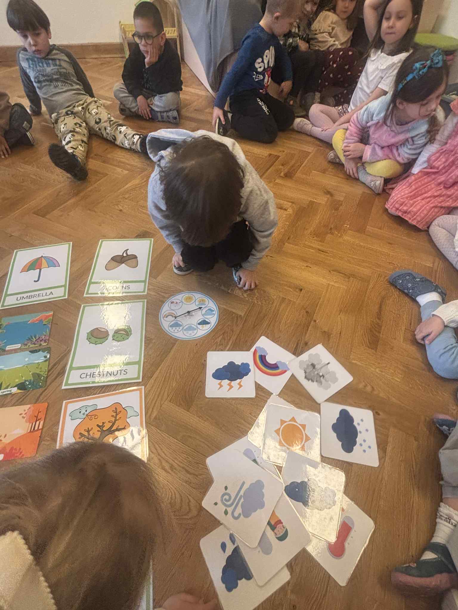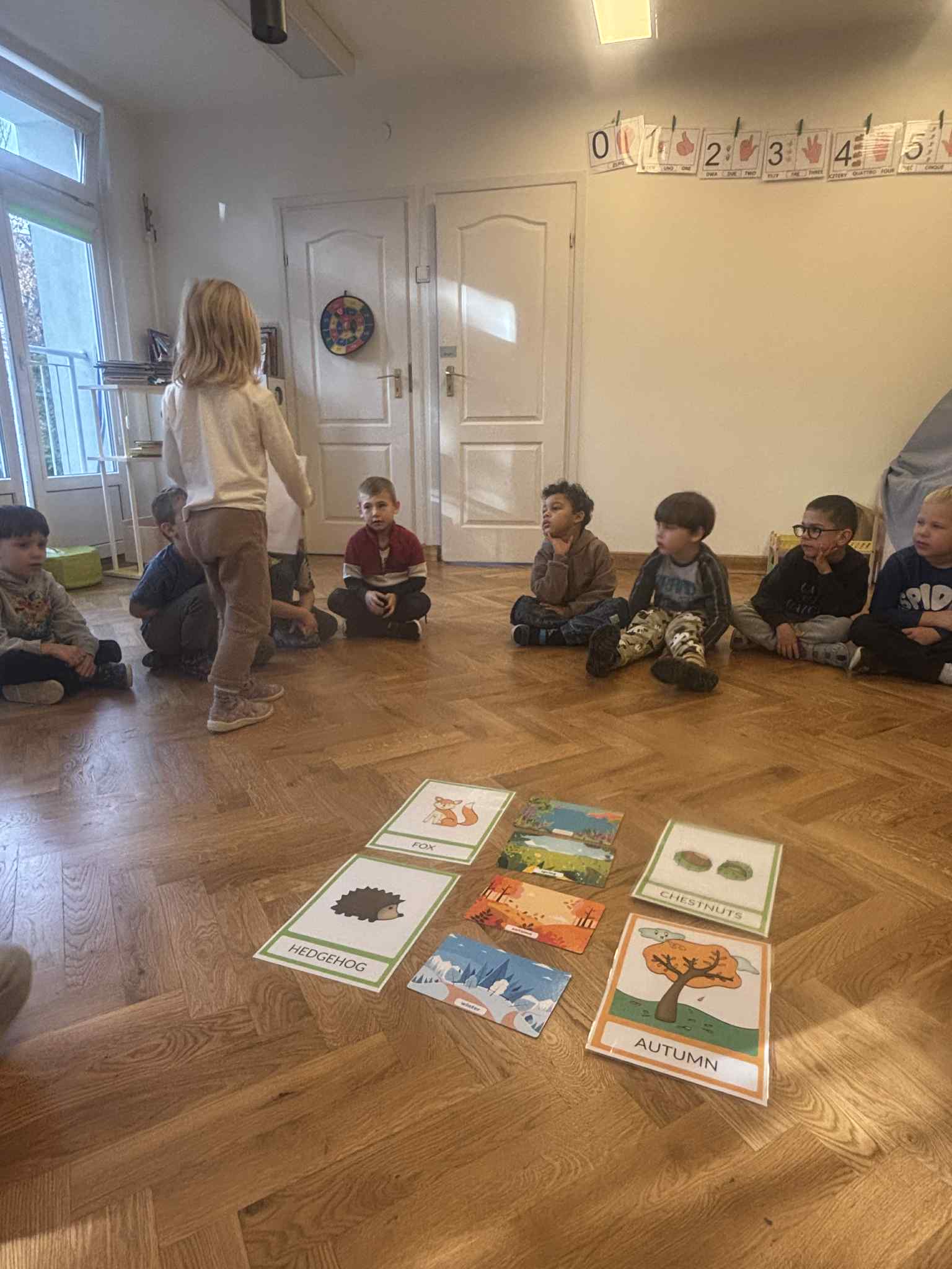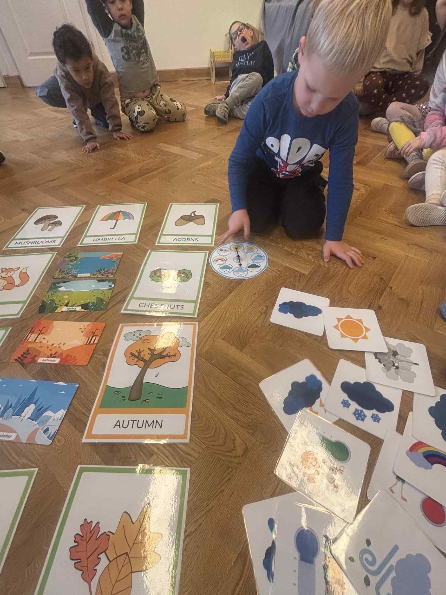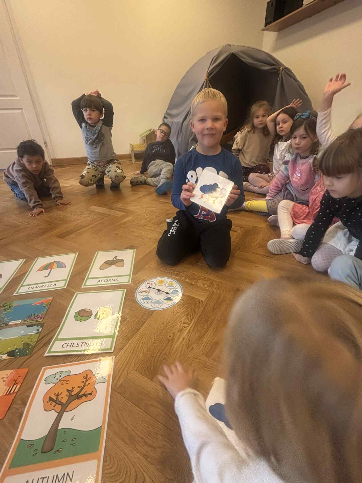 Przedszkolaki utrwalały słownictwo związane z jesienią, pogodą, zwierzętami i przyrodą.