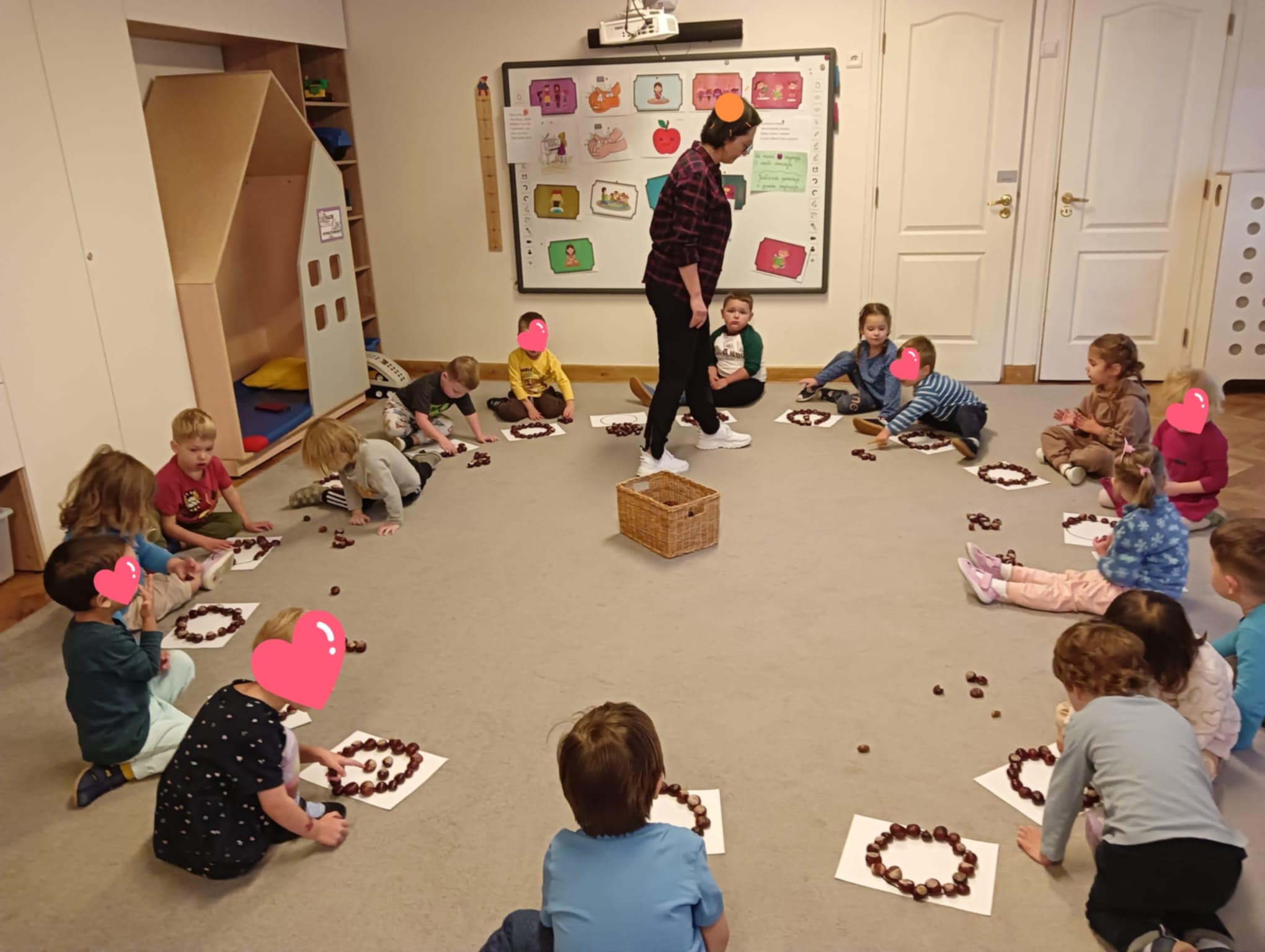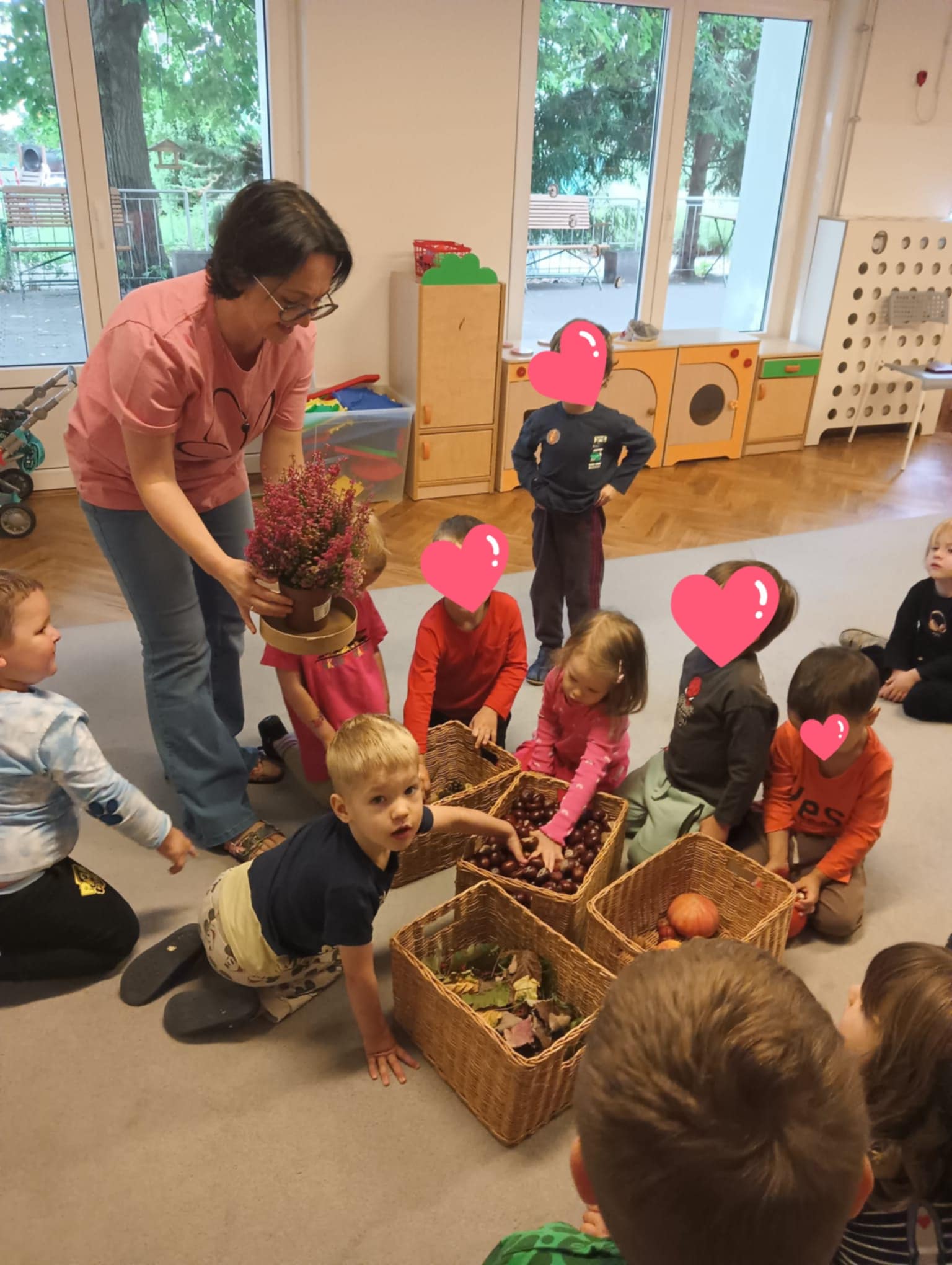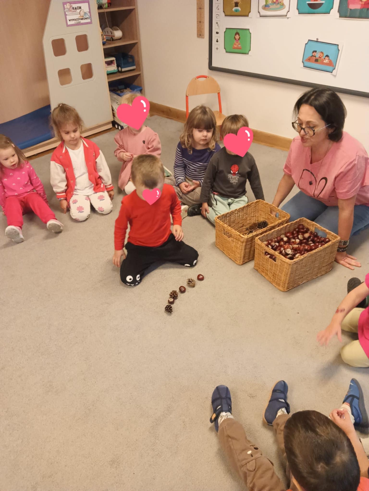 U Jeżyków zrobiło się prawdziwie jesiennie! Dzieci z ciekawością odkrywały dary jesieni – kasztany, żołędzie, liście i owoce. Liczyły, porównywały, układały i tworzyły z nich piękne prace. Było dużo wspólnej zabawy, eksperymentowania i rozmów o tym, co zmienia się w przyrodzie.