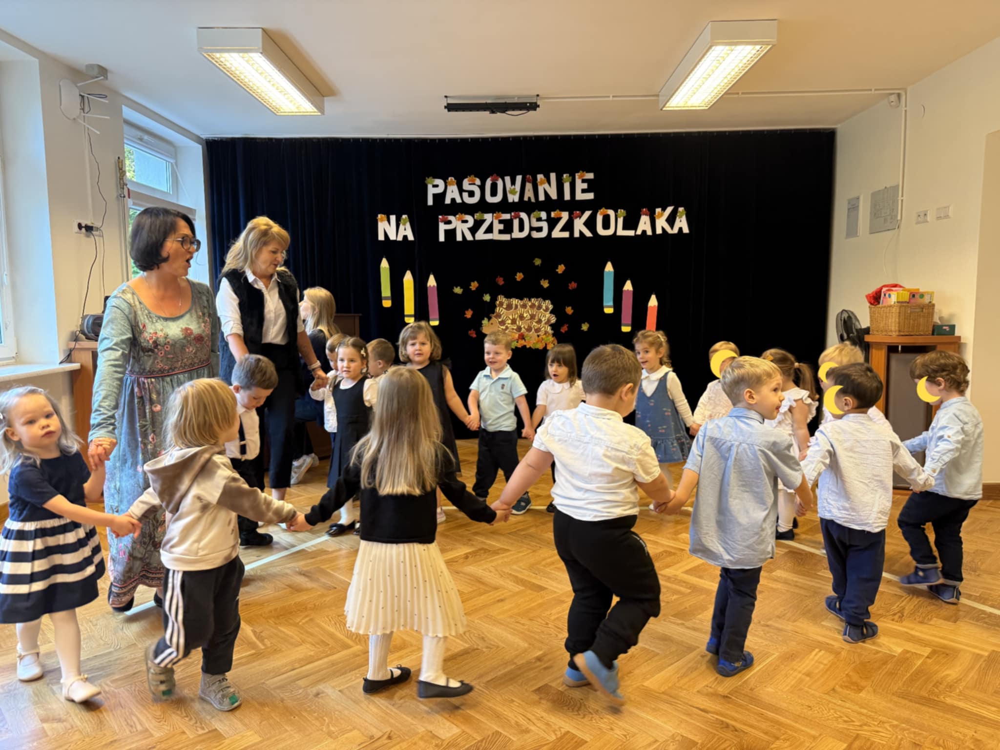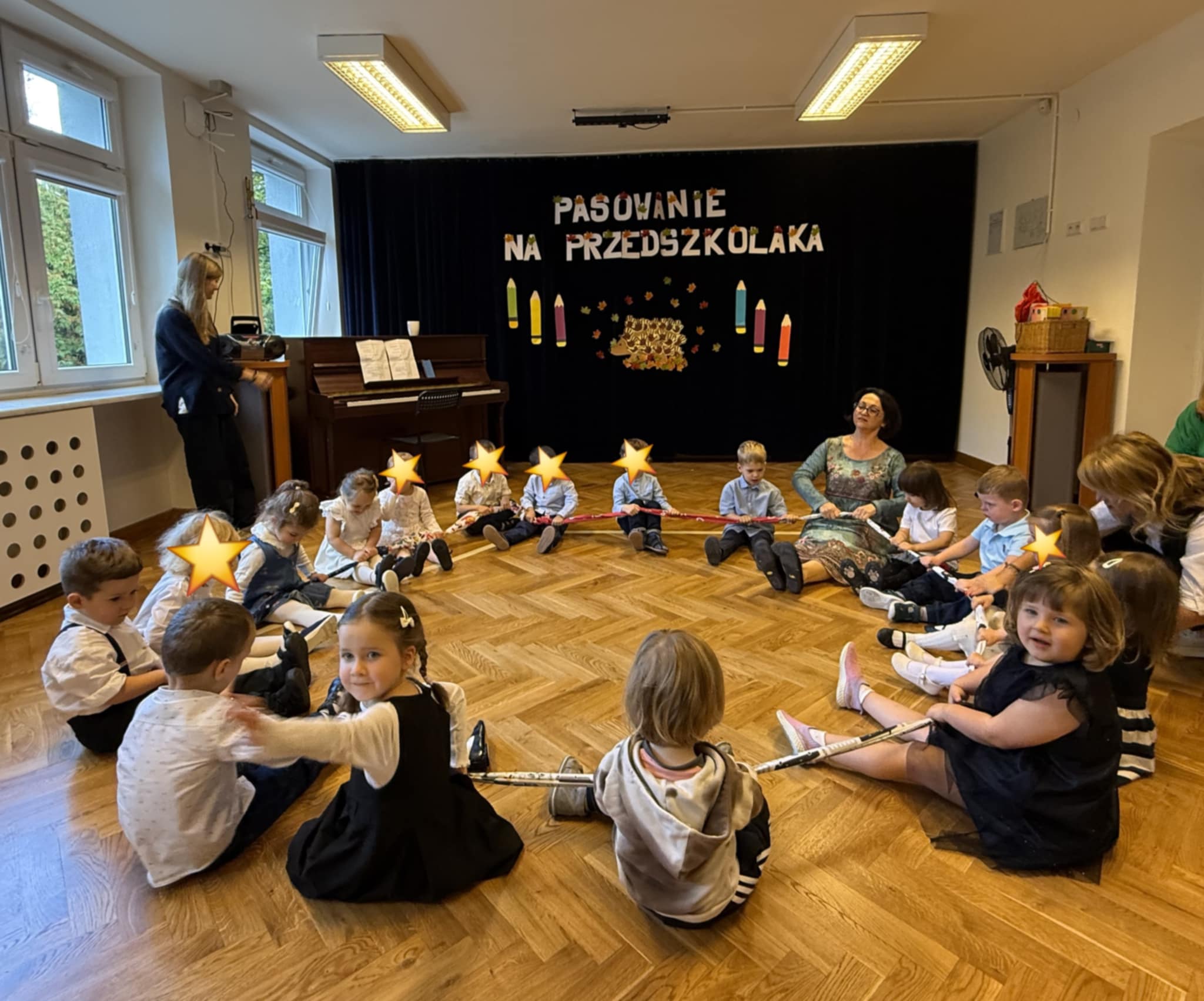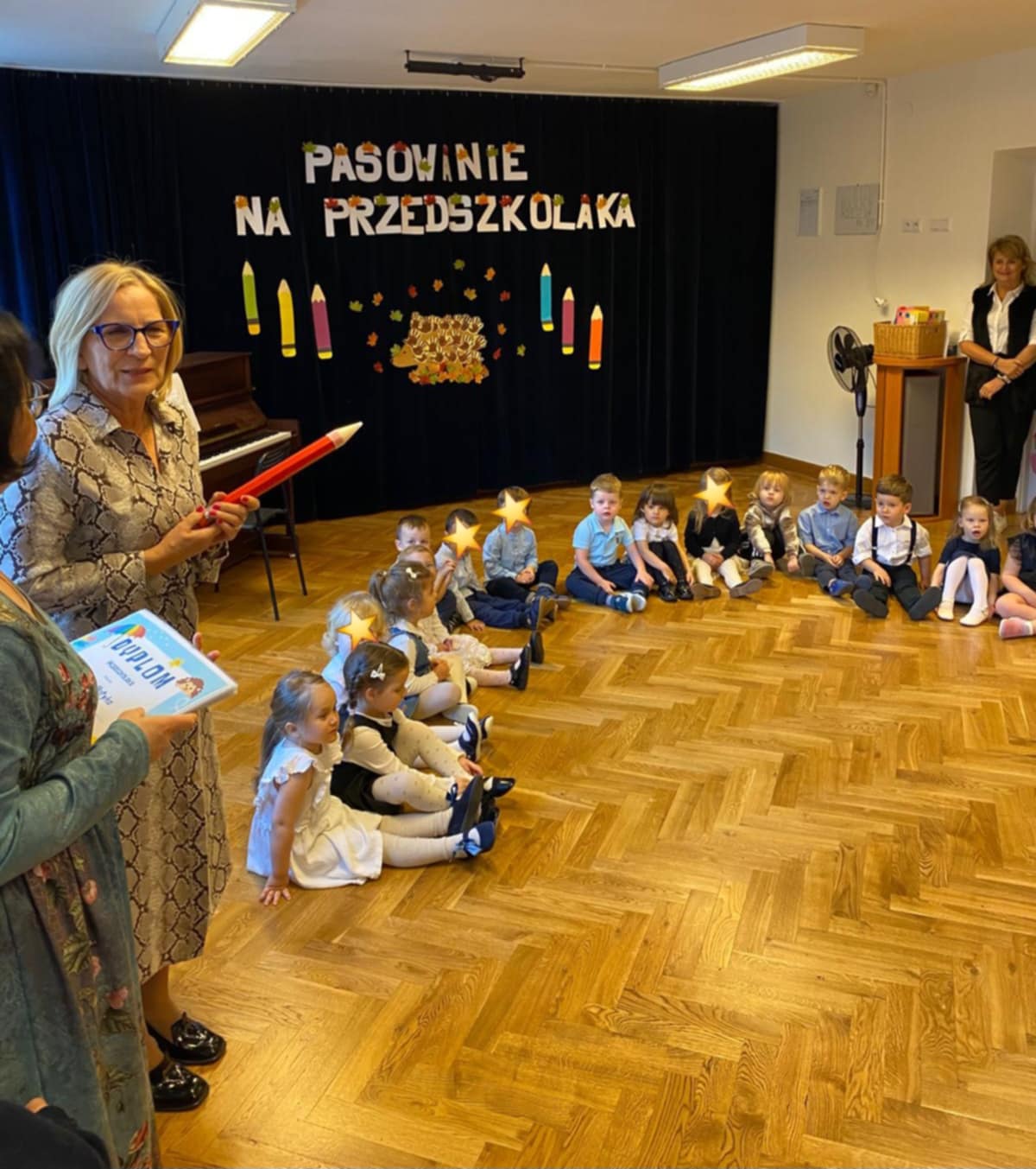 Podczas uroczystości dzieci zaprezentowały swoje talenty – były piosenki, wierszyki i tańce, a publiczność nie szczędziła braw! Po występach nastąpił najbardziej oczekiwany moment – pani dyrektor dokonała uroczystego pasowania, zamieniając naszych małych artystów w prawdziwych przedszkolaków.