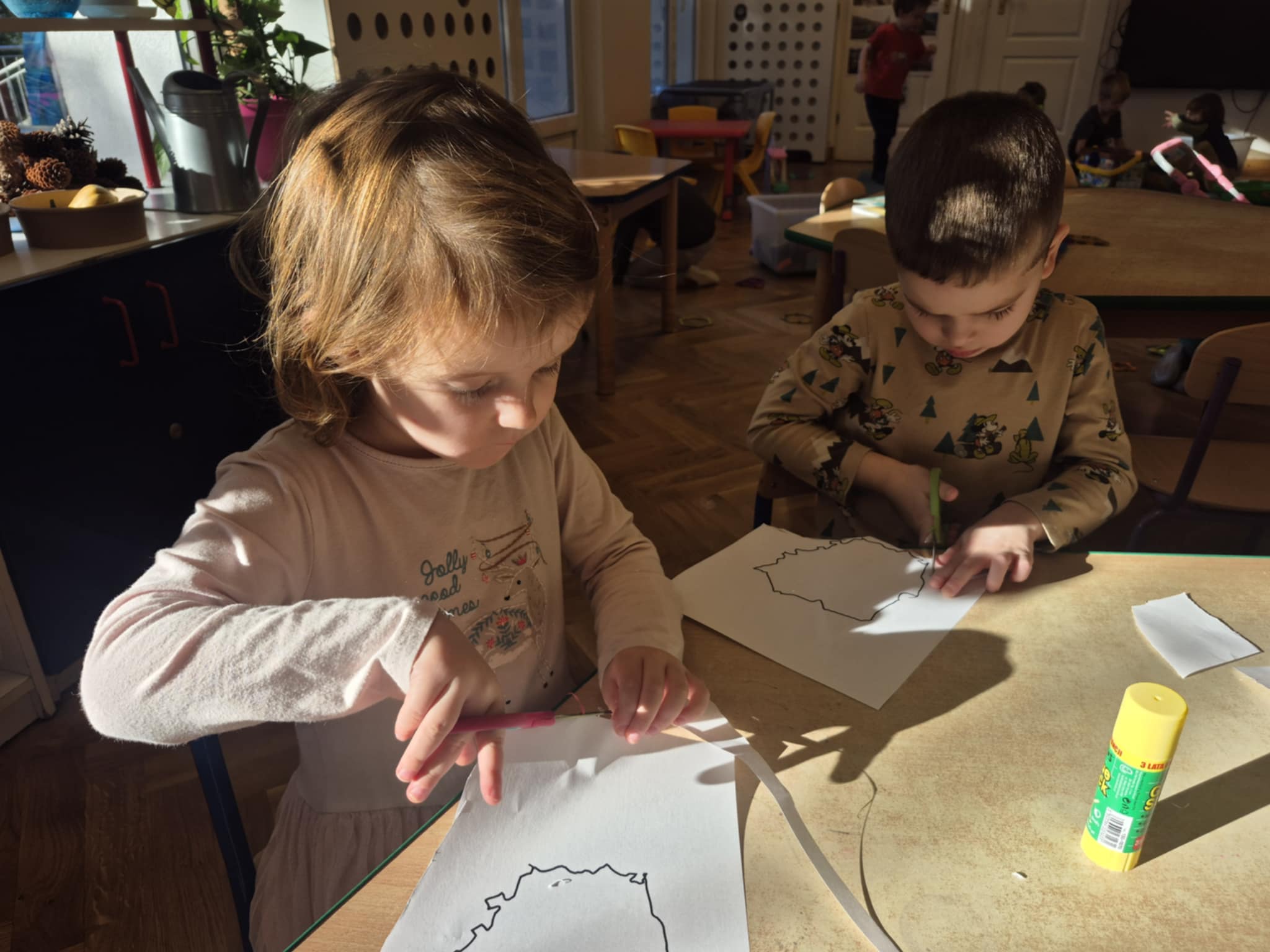 Najpierw powstały piękne prace plastyczne przedstawiające mapę Polski w biało-czerwonych barwach — dużo wycinania, zgniatania, klejenia i rozmów o naszych symbolach narodowych.